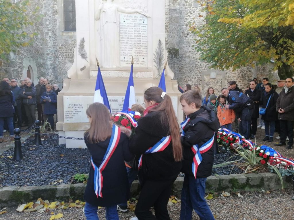 De nombreux Mesnilois étaient présents autour du Monument aux Morts pour la commémoration du 11 novembre ce samedi sous un ciel clément. Cette année, nous commémorons les 100 ans de l’allumage de la flamme du soldat inconnu et l’inauguration de la restauration de notre Monument aux Morts. Une cérémonie bien évidemment en l’honneur de tous les morts pour la liberté et pour la France lors de la première guerre mondiale mais également pour ceux des divers conflits passés et actuels. Les élèves de troisième du collège Sainte Thérèse ont comme à chaque commémoration participé avec émotion par des lectures. Ont suivi le dépôt de fleurs par des enfants aidés par les scouts, une minute de silence et les discours des représentants des associations dédiées au souvenir et du Maire. La Marseillaise et l’Hymne Européen, chantés par l’Air de Rien et les Chœurs du Mesnil ont ponctué la cérémonie.